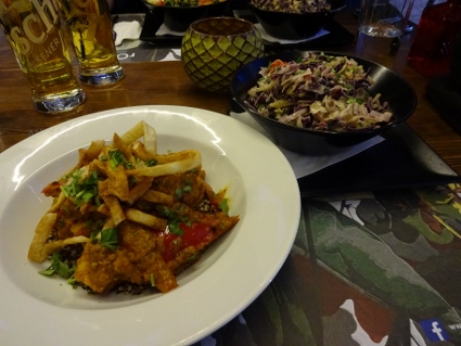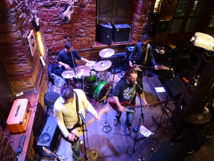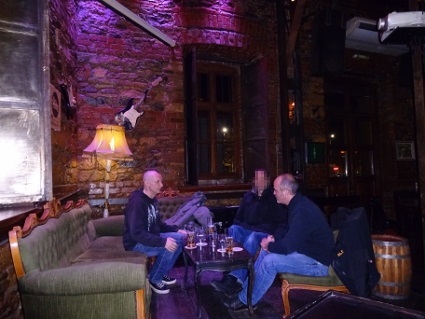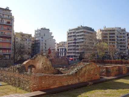 Nun hatten wir ein wenig Appetit, der uns in eine der häufig anzutreffenden Join Juice Bars führte, die erfreulicherweise eine ordentliche Vegan-Abteilung auf der Karte hatten. Neben dem Saft entschied ich mich unglücklicherweise für einen Noodles Salad, welcher sich als ziemlich schwierig zu essen herausstellte. Das knackige Gemüse war top, aber die mit viel Biss servierten Reisnudeln waren so lang und steif, dass ich mir mit dem zur Verfügung stehenden Besteck ziemlich einen abbrechen musste. Typisches Gericht für eine negative Energiebilanz. Nachdem wir vergeblich eine Drogerie gesucht hatten (Apotheken hingegen sahen wir im Dutzend), klapperten wir einige der ausgewiesenen Sehenswürdigkeiten ab, z.B. die Rotunde und den Galeriusbogen. Auffallend war, dass sämtliche alten Gemäuer einige Meter tiefer lagen als das aktuelle Bodenniveau. Da müssen sie das Städtchen ja mal ganz schön aufgebockt haben im Laufe der Jahre. Nach dem vielen Rumlaufen war mir nach einer kleinen Liegepause im Hotel, aber für die Nachtruhe war es natürlich noch zu früh. Also gingen wir nochmal los Richtung Ladadika, dem ausgewiesenen Szeneviertel, wo wir in der Rover Bar in einen Soundcheck platzten. Zwei Bands mit scheinbar recht ähnlicher Besetzung ließen sich ziemlich viel Zeit beim Justieren, aber es waren eh noch kaum Gäste da. Um nicht im Weg rumzustehen, suchten wir uns eine Etage weiter oben einen Balkonplatz, von wo aus wir das Treiben im geschmackvoll eingerichteten Club entspannt beobachten konnten. Laut fb-event sollte es erst um 21:45 h losgehen, doch schließlich schlug die Glocke sogar 11, bis Overpower endlich starteten. Einige Besucher waren auch rechtzeitig aufgetaucht, so dass eine ganz nette Atmosphäre herrschte. Die Mucke riss uns jetzt nicht gnadenlos von den Hockern, ließ sich an einem eher gemächlichen Abend aber gut goutieren. Adult Oriented Rock 'n' Roll mit leichtem Punkeinschlag wäre wohl eine halbwegs passende Beschreibung für das Dargebotene. Der Song "Long Day" ist sogar hängen geblieben, außerdem kann ich mich dunkel an ein Neil Young - Stück erinnern. Uns war es nach der ersten Band jedenfalls schon spät genug, wir mussten ja auch noch irgendwo Pommes essen, also machten wir den Schuh, und nach besagtem Nachtmahl erreichten wir gegen halb zwei wieder unser Domizil. |