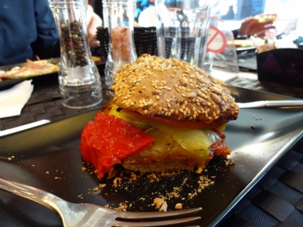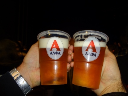 Gegen 7 Uhr in der Früh begab ich mich zum Bahnhof, wo Lars praktisch zeitgleich ebenso eintrudelte. Mit dem ICE fuhren wir non-stop zum Flughafen Frankfurt, um uns dort nach einigem Suchen in der Check-in-Schlange einzureihen. Die Mitfliegenden brauchten alle eine halbe Ewigkeit am Schalter, warum auch immer, bei uns ging es dann ziemlich flott. Anschließend blieb noch Zeit für ein erstes Pils am sündhaft teuren Airport-Bistrot, bevor wir die nervigen Sicherheitskontrollen passierten. Leicht nervös war ich wohl schon, wie mir meine Achselhöhlen signalisierten. Irgendwo am hinterletzten Gate bei mächtig Verkehrslärm wurden wir mit einiger Verspätung endlich in den Flieger gehieft. Einmal an Bord lief es dann aber ganz fluffig, kaum Turbulenzen, gute Aussicht, und nach etwa zweieinhalb Stunden landeten wir auch schon in Thessaloniki. Der dortige Flughafen präsentierte sich angenehm übersichtlich, so dass wir auch schnell den Bussteig ausfindig gemacht hatten. Schmale zwei Euro kostete das Ticket, das uns ins kilometerweit entfernte Zentrum brachte. Der Bus füllte sich unterwegs ordentlich, während wir überlegten, wann wir wohl sinnvollerweise aussteigen sollten. Lars navigierte per Handy absolut passend, so dass der Weg zum Hotel ein kurzer war. Der erste Eindruck von der Stadt war ein eher hässlicher, die Wohnbebauung gleichmäßig unschön, auf den Straßen brausender Verkehr. An einer solchen befand sich auch unsere Herberge, doch unsere Zimmer lagen zum Glück an einem recht ruhigen Hinterhof und machten auch sonst einen ganz guten Eindruck. Ein schlichtes Laken als Bettdecke war aber mal eher ein Scherz, immerhin lagen noch Wolldecken im Schrank. Da es schon langsam auf den Abend zuging, musste selbstredend eine Stärkung her. Per Happy-Cow lotste ich uns ins nahe rOOTS in einer interessanten Seitenstraße, wo heute Indian Vegan Night war. Mit lecker Leitungswasser wurden wir begrüßt, und bald schon traf die Bestellung ein. Jeder genehmigte sich einen üppig-knackigen Salat, dazu Curry Tikka Masala (Lars) bzw. Tandoori Tofu. Es schmeckte vorzüglich und war womöglich die beste Speisung des ganzen Urlaubs. Ein zweites Bier zu ordern, gestaltete sich etwas mühsam, aber so sollte es uns noch öfter gehen in den kommenden Tagen. Alsbald machten wir uns auf den Weg zum Principal Club, der sich einigermaßen zog, zumal er an einer schnöden breiten Straße entlang führte. Der Schuppen selbst gemahnte an die neue Batschkapp, auch in etwa von der Größe her. Von der Kassendame namentlich angesprochen nahm ich sogleich unsere Tickets entgegen. Noch wirkte die geräumige Halle recht dünn besiedelt, wodurch auch die Zapfstellen gut zugänglich waren. Wir entschieden uns für zwei Alpha á 4 Euro und behielten diesen Bestellvorgang für den Rest des Abends bei, auch wenn drei im Sparpaket für 10 Tacken im Angebot waren. |
