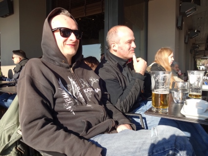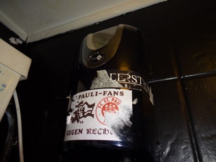 Clumsy fand sogar die begehrte weiß-blaue Keramik, die er zu kaufen beauftragt worden war. Nun brachten wir die Einkäufe in Sicherheit und gabelten den genesenen Gonzo auf, um schließlich im Locomotiva wiederum zum örtlichen FCSP-Fanclub zu stoßen. Inmitten einer Bibliothek mit allerhand linker Literatur lief dort das Spiel der Braun-Weißen gegen Darmstadt auf Sky, und es stand bereits 0:1 bei unserem Eintreffen. Es war ein ziemliches Gewürge, nicht schön anzuschauen, es fiel auch kein Tor mehr, aber das Grüppchen war nett. Mit zwei oder drei Bierchen intus rannten wir anschließend eine Weile durch die Gegend, Lars im Affenzahn immer vorneweg. Ich weiß gar nicht mehr genau, wo wir hinwollten, aber schließlich landeten wir in einem eher türkisch anmutenden, einfachen Lokal ziemlich mittendrin. Der Ober war von der ganz lässigen Sorte, hörte sich unsere gesamte Bestellung an, um dann fast fehlerfrei nochmal zusammenzufassen. Die Jungs brauchten totes Tier, serviert auf enormer Teigunterlage, während ich gefüllte Tomaten und Pommes wählte. Schlicht aber sehr lecker. Von den grilled peppers kostete ich lediglich die Spitze und nahm schnell Abstand, während Gonzo größere Fasern beinahe problemlos in sein Körperinneres aufnahm. Schon erstaunlich, wie unterschiedlich Schärfe wahrgenommen wird. Gut gesättigt bewegten wir uns wieder zu unserem Kiez, wo wir noch eine dezente Kneipe aufsuchten. Ein Abschlussbierchen musste schon sein, aber lang würde der Abend nicht mehr werden, selbst Lars wirkte schon nicht mehr durstig. Gegen 22 Uhr Ortszeit verließen wir dann den Laden, aber irgendetwas ließ uns noch in den Pub direkt gegenüber schlittern. Dort lief gerade W.A.S.P., an den Wänden hingen lauter Metal-Plakate und mir war klar, dass es hier wohl noch eskalieren würde. Zumal die Mucke richtig klasse war, aufgelegt von konkretem Deejay, der unsere Wünsche erahnte, wenn wir sie ihm nicht bereits selbst mitgeteilt hatten. Psychotic Waltz, Fates Warning, While Heaven Wept, Queensryche, etc. Wer will angesichts solch himmlischer Sounds denn schon ins Bett? Wir jedenfalls noch nicht, zumal das Mythos in eisgekühlten Humpen serviert wurde. Also blieben wir noch zwei, drei Stündchen, genehmigten uns zum Abschluss Jacky-Sprite und hatten mächtig Spaß. Zu guter Letzt überkam mich Wasserdurst biblischen Ausmaßes, der mich sämtliche vier oder fünf der muffigen Gläser innerhalb kürzester Zeit in mich hinein stürzen ließ. Gegen ein Uhr siegte schließlich der Restverstand, so dass wir uns in die Horizontale begaben, ausnahmsweise alle zeitgleich. |