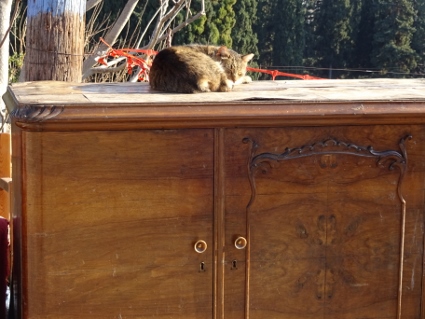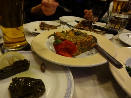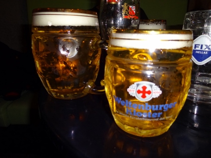 Das späte Aufstehen wurde langsam zur Gewohnheit, so auch heute, man musste schließlich irgendwie das ebenso späte Zubettgehen kompensieren. Für die erste Mahlzeit des Tages steuerten wir einen auf mexikanisch getrimmten Imbiss an, wo ich erneut Probleme beim Verzehr bekommen sollte. Diesmal war es der Burrito, der recht untight komponiert war und deswegen beim Essen in Teilen zu Boden ging. Der Salat hingegen lief gut rein. Ein bisschen mehr Pikanterie hätten wir uns gewünscht, so blieb das Ganze etwas fad wenn auch nahrhaft. Zum Abrunden gönnten wir uns draußen unterm Heizpilz jeder noch ein Heißgetränk. Da unsere beiden Compagnons im Anflug waren, wussten wir nicht genau, wann wir sie in Empfang nehmen würden, gingen aber trotzdem mal Richtung Oberstadt. Und dort wurde es tatsächlich ziemlich nett, denn die Hektik des Zentrums wich schnell einer ruhigen Beschaulichkeit. Entlang eines langen Abschnitts der alten, trutzigen Stadtmauer erklommen wir die Anhöhe, vorbei an in der Sonne dösenden Vierbeinern und idyllischer werdenden Wohnhäusern. Der Ausblick über die Stadt bis zum Meer war recht beeindruckend. Wahrscheinlich gelangten wir noch bis zu den unteren Mauern der Zitadelle, bis wir schließlich umkehren mussten, um Gonzo und Clumsy zu treffen. Sie kamen trotz Flugumleitung noch relativ früh per Bus in Thessaloniki an und schafften auch den Fußweg vom Bahnhof problemlos. Nun waren wir also komplett, die neue Zimmeraufteilung stellte kein Problem dar, und alsbald fanden wir uns erneut in der Rover Bar ein, um ein Begrüßungsschlückchen zu nehmen. Etwas zugig fanden wir es auf der edlen Sitzgruppe, doch das tat dem Genuss des Fischer-Biers keinen Abbruch. |