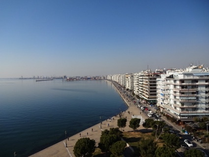 Das Hotel-Frühstück kam für mich zu früh, doch Lars ging hin und ließ mich wissen, dass ich nichts verpasst hätte. Außer Dosenobst wäre für mich wohl nichts Nennenswertes im Angebot gewesen, also konnte ich das Thema gleich abhaken. Eine Notration Brot und Aufstrich plus Riegel hatte ich ja wie immer dabei. Bei sonnigem aber nicht allzu warmem Wetter machten wir uns am Tag ohne festes Programm auf den Weg, die Stadt ein wenig zu erkunden. Bemerkenswert waren die überdachten Marktstraßen, wo allerhand Lebensmittel und mehr feilgeboten wurde. Neben lecker Obst und Gemüse fielen mir jede Menge Leichenteile unschön auf. An einem Stand sah ich gar zwei Boxen randvoll mit lebenden Schnecken. Schnell weiter. An der mit reichlich Autoverkehr gesegneten aber trotzdem recht netten Uferpromenade quatschten uns gleich mal zwei vermeintliche Reggae-Jamaikaner bezüglich Hakuna Matata an, um uns im Handstreich bunte Freundschaftsbändchen zu verpassen, die Lars locker 5 Euronen "wert" waren. Mit uns kann man's ja machen. So ausgerüstet schlenderten wir weiter zum Weißen Turm, dem vermeintlichen Wahrzeichen Thessalonikis, bevor wir eine der Lokalitäten an der Uferstraße aufsuchten. Dick angezogen ließ es sich dort für drei Bierchen bestens in der Sonne aushalten, erster Freiluftschoppen des Jahres also im Januar, feine Sache. Landestypisch gab es auch hier Wasser zur Begrüßung und Knabbereien zum Bier, jedoch mussten man für Bestellung zwei und drei wieder selbst aktiv werden. Während wir chillten, kamen etliche Straßenverkäufer vorbei, die vom Bleistift über Post-it bis Tatü alles mögliche anboten, was mensch womöglich hätte gebrauchen können, dazu der eine oder andere "normale" Schnorrer. Ansatzweise leicht nervig zeigte das wohl (wie auch regelmäßig anzutreffende Bettler im Stadtbild), dass im Land eine nennenswert arme Bevölkerungsschicht vorhanden sein musste. Gleichzeitig sah man aber auch genügend wohlstandserprobte Einwohner, die es sich gutgehen ließen. Daneben konnten wir noch beobachten, wie zwei fleißige Handwerker zwei Stockwerke über uns eine neue Markise anbrachten, zum Glück ließen die Jungs außer ein wenig Bohrstaub nichts auf uns herabfallen. |