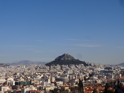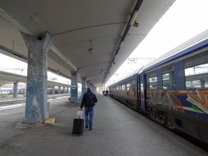 Ungewöhnlich früh mussten wir raus, denn um 10 sollte unsere Bahn gen Athen starten. Also hiefte ich mich gegen halb 9 aus der Kiste, ließ den Lynch-Zwerg telefonisch checken, ob bei den Kollegen im Doppelzimmer alles fit war, und machte mich selbst startklar. Weit war es nicht bis zum Bahnhof, nur der Eingang war wegen umfassender Baustellen schwer zu erreichen. Vorher plünderte Clumsy noch sämtliche Alpha-Vorräte in einem vorgelagerten Kiosk, ich enthielt mich der Bestellung. Die Hauptstation der zweitgrößten Stadt des Landes entpuppte sich als heruntergekommener Provinzbahnhof, zumindest nach hiesigen Maßstäben. In dem ziemlich kurzen Zug enterten wir die nicht sehr noble 1. Klasse, wo wir in unserem Abteil noch ein paar Stationen lang die Gesellschaft eines griechischen Pärchens genossen. Irgendwann tauchte sogar ein Kontrolleur auf, der recht oberflächlich unsere Tickets checkte. Es wirkte, als wären sie froh, wenn überhaupt jemand dort Bahn fährt. So zuckelten wir also los, mir war flau, die Kollegen tranken Alpha, und die Landschaft zeigte sich zusehends malerisch. Spätestens auf dieser stundenlangen Fahrt konnten wir feststellen, dass dieses Griechenland wirklich schön ist. Viel recht karge aber wohlgeformte Gegend, meist nur dünn besiedelt, daher kaum Menschen und ebenso wenige Tiere erspähten unsere Klüsen. Bemerkenswert auch viele hohe Berge mit schneebedeckten Kuppen. Zwischendurch standen wir längere Zeit auf offener Strecke, vermutlich um den Gegenverkehr passieren zu lassen, währenddessen man ganz in Ruhe den Blick schweifen lassen konnte. Allerdings dauerte die ganze Fahrt so noch länger als veranschlagt, so dass wir über sechs Stunden unterwegs waren. Irgendwann wird dies sicher schneller gehen, wenn die im Bau befindliche neue Strecke dereinst fertig sein wird, die stellenweise im Ansatz bereits zu sehen war. Immerhin wirkte der Athener Hauptbahnhof bereits halbwegs runderneuert, kein Vergleich zu Thessaloniki. Auch die Stadt selbst wirkte hübscher, wie wir auf dem Weg zum Hotel feststellen konnten. Zur Begrüßung wurde O-Saft gereicht, und schnell waren die neuen Zimmer bezogen. Nachdem ich auf der langen Fahrt schon mit der Müdigkeit zu kämpfen hatte, genehmigte ich mir knapp zwei Stunden Auszeit, während der ich versuchte, etwas Schlaf zu bekommen, was wegen Kälte und umliegender Geräusche jedoch nicht klappen wollte. Trotzdem fühlte ich mich ein wenig erholt, als ich mich gegen 19 Uhr aufmachte, die drei Kapeiken wieder zu treffen. |