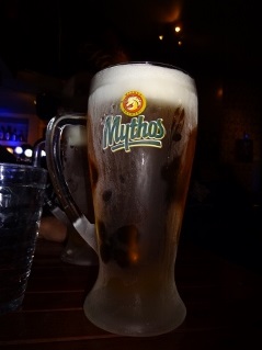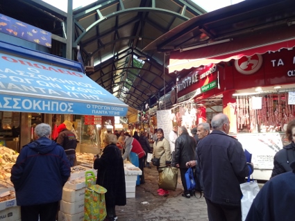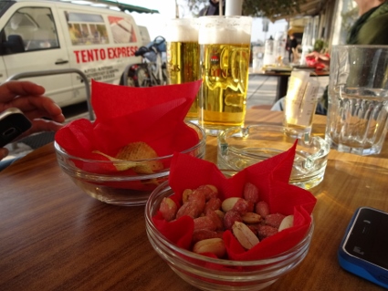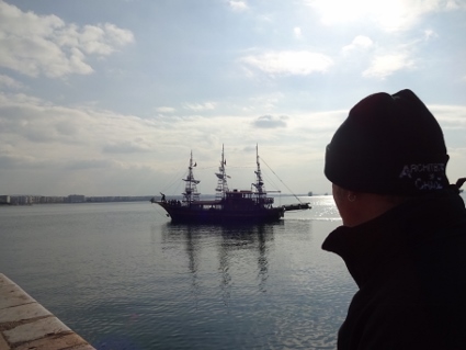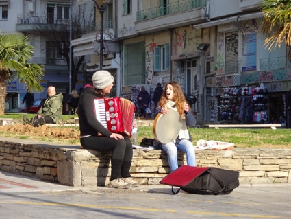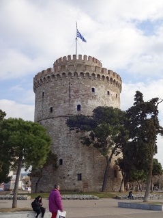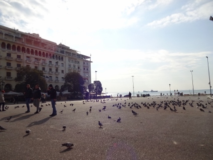 Das Hotel-Frühstück kam für mich zu früh, doch Lars ging hin und ließ mich wissen, dass ich nichts verpasst hätte. Außer Dosenobst wäre für mich wohl nichts Nennenswertes im Angebot gewesen, also konnte ich das Thema gleich abhaken. Eine Notration Brot und Aufstrich plus Riegel hatte ich ja wie immer dabei. Bei sonnigem aber nicht allzu warmem Wetter machten wir uns am Tag ohne festes Programm auf den Weg, die Stadt ein wenig zu erkunden. Bemerkenswert waren die überdachten Marktstraßen, wo allerhand Lebensmittel und mehr feilgeboten wurde. Neben lecker Obst und Gemüse fielen mir jede Menge Leichenteile unschön auf. An einem Stand sah ich gar zwei Boxen randvoll mit lebenden Schnecken. Schnell weiter. An der mit reichlich Autoverkehr gesegneten aber trotzdem recht netten Uferpromenade quatschten uns gleich mal zwei vermeintliche Reggae-Jamaikaner bezüglich Hakuna Matata an, um uns im Handstreich bunte Freundschaftsbändchen zu verpassen, die Lars locker 5 Euronen "wert" waren. Mit uns kann man's ja machen. So ausgerüstet schlenderten wir weiter zum Weißen Turm, dem vermeintlichen Wahrzeichen Thessalonikis, bevor wir eine der Lokalitäten an der Uferstraße aufsuchten. Dick angezogen ließ es sich dort für drei Bierchen bestens in der Sonne aushalten, erster Freiluftschoppen des Jahres also im Januar, feine Sache. Landestypisch gab es auch hier Wasser zur Begrüßung und Knabbereien zum Bier, jedoch mussten man für Bestellung zwei und drei wieder selbst aktiv werden. Während wir chillten, kamen etliche Straßenverkäufer vorbei, die vom Bleistift über Post-it bis Tatü alles mögliche anboten, was mensch womöglich hätte gebrauchen können, dazu der eine oder andere "normale" Schnorrer. Ansatzweise leicht nervig zeigte das wohl (wie auch regelmäßig anzutreffende Bettler im Stadtbild), dass im Land eine nennenswert arme Bevölkerungsschicht vorhanden sein musste. Gleichzeitig sah man aber auch genügend wohlstandserprobte Einwohner, die es sich gutgehen ließen. Daneben konnten wir noch beobachten, wie zwei fleißige Handwerker zwei Stockwerke über uns eine neue Markise anbrachten, zum Glück ließen die Jungs außer ein wenig Bohrstaub nichts auf uns herabfallen. |