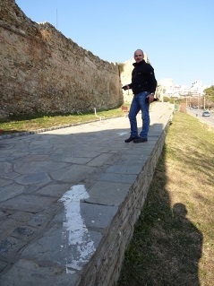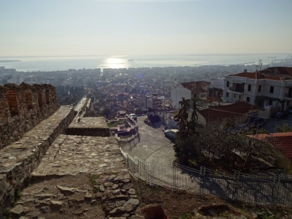 Das späte Aufstehen wurde langsam zur Gewohnheit, so auch heute, man musste schließlich irgendwie das ebenso späte Zubettgehen kompensieren. Für die erste Mahlzeit des Tages steuerten wir einen auf mexikanisch getrimmten Imbiss an, wo ich erneut Probleme beim Verzehr bekommen sollte. Diesmal war es der Burrito, der recht untight komponiert war und deswegen beim Essen in Teilen zu Boden ging. Der Salat hingegen lief gut rein. Ein bisschen mehr Pikanterie hätten wir uns gewünscht, so blieb das Ganze etwas fad wenn auch nahrhaft. Zum Abrunden gönnten wir uns draußen unterm Heizpilz jeder noch ein Heißgetränk. Da unsere beiden Compagnons im Anflug waren, wussten wir nicht genau, wann wir sie in Empfang nehmen würden, gingen aber trotzdem mal Richtung Oberstadt. Und dort wurde es tatsächlich ziemlich nett, denn die Hektik des Zentrums wich schnell einer ruhigen Beschaulichkeit. Entlang eines langen Abschnitts der alten, trutzigen Stadtmauer erklommen wir die Anhöhe, vorbei an in der Sonne dösenden Vierbeinern und idyllischer werdenden Wohnhäusern. Der Ausblick über die Stadt bis zum Meer war recht beeindruckend. Wahrscheinlich gelangten wir noch bis zu den unteren Mauern der Zitadelle, bis wir schließlich umkehren mussten, um Gonzo und Clumsy zu treffen. Sie kamen trotz Flugumleitung noch relativ früh per Bus in Thessaloniki an und schafften auch den Fußweg vom Bahnhof problemlos. Nun waren wir also komplett, die neue Zimmeraufteilung stellte kein Problem dar, und alsbald fanden wir uns erneut in der Rover Bar ein, um ein Begrüßungsschlückchen zu nehmen. Etwas zugig fanden wir es auf der edlen Sitzgruppe, doch das tat dem Genuss des Fischer-Biers keinen Abbruch. |