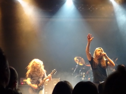 The Silent Wedding aus Athen begaben sich bald in ihre Anheizerrolle und hatten natürlich auch ein paar eigene Fans dabei. Übermäßig zünden konnte ihre Dream Theater light - Chose jedoch nicht, dazu klangen sie mir ein wenig zu seicht, allein schon durch das viel zu dominante Keyboard. Immerhin blieb ein passables "Gutter Ballett" - Cover zum Schluss in wohlwollender Erinnerung. Iced Earth stellten darauf wenig überraschend ein ganz anderes Kaliber dar. Mit ordentlich Druck starteten sie in eine geschmackvoll zusammengestellte Setlist, die eine ausgewogene Mischung aus Kompositionen jüngeren Datums und unsterblicher Klassiker darstellte. Auch wenn Hits wie "Burning Times" oder "I Died For You" natürlich immer die Nase vorn haben werden, kacken "Great Heathen Army" oder "Black Flag" daneben nicht unbedingt ab, sondern sorgen für die nötigen frischen Akzente. Der Sound war gut, die Stimmung auch, und irgendjemand musste ja das heimische Gebräu trinken. Das griechische Publikum tat es eher nicht und beschränkte sich weitgehend aufs Rauchen, zeigte sich aber trotzdem energiegeladener als deutsche Auditorien, was mit dem jüngeren Durchschnittsalter zu tun gehabt haben könnte. Wir waren jedenfalls so ziemlich die ältesten Säcke weit und breit. Spaß hatten wir trotzdem zuhauf, besonders wenn der Bandchef drauflos schredderte, wie nur er es kann. Mit Stu Block hat er nun ja auch einen mittlerweile etablierten Sänger an Bord, der bestens ins Gefüge passt, auch wenn mir dessen pathetische Ansagen bisweilen etwas auf den Zeiger gingen. Der Rest der Besetzung verrichtete solide seinen Dienst, ohne nennenswert aufzufallen. Im letzten Drittel ging es jedenfalls langsam ans Eingemachte mit der "Something Wicked" - Trilogie und dem vom Chef selbst intonierten "Stormrider", einzig "The Hunter" wurde außen vor gelassen. Schließlich noch die Zugabe bestehend aus dem schmissigen "Clear The Way" sowie "Watching Over Me", das ich entspannt anging, um dann doch Klüsenpippi zu kriegen. Amtlicher Schlussapplaus nach knapp zwei Stunden Show, die Band ließ sich zu Recht feiern, und plötzlich ging Lars vor mir zu Boden im leichten Tumult. Mit blutender Schramme am Finger tauchte er triumphierend wieder auf, um ein original Schaffer-Plek zu präsentieren, putzig. Wir nippten noch ein bisschen Alpha, bis wir mehr oder weniger heraus komplimentiert wurden. Auf dem Rückweg machten wir halt an einer der mit eigenem, brüllend laut rödelnden Aggregat betriebenen Imbissbuden, um den nächtlichen Pommesappetit zu stillen, und schließlich bestand Lars noch auf einer Einkehr in einen ganz netten Pub mit halbrockiger Beschallung aber recht ekligem Bier (aus Weizengläsern). Gegen 02:30 h landeten wir wieder im Hotel, wo ich beim Stolpern über die Duschenbegrenzung ungeplant die Stabilität meines Steißbeins testete. Von Crippled Black Phoenix' "Live at Burg Herzberg" ließ ich mich schließlich (nicht zum letzten Mal) in den Schlaf lullen. |