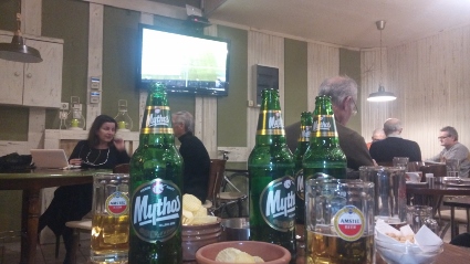 Gegen 7 Uhr in der Früh begab ich mich zum Bahnhof, wo Lars praktisch zeitgleich ebenso eintrudelte. Mit dem ICE fuhren wir non-stop zum Flughafen Frankfurt, um uns dort nach einigem Suchen in der Check-in-Schlange einzureihen. Die Mitfliegenden brauchten alle eine halbe Ewigkeit am Schalter, warum auch immer, bei uns ging es dann ziemlich flott. Anschließend blieb noch Zeit für ein erstes Pils am sündhaft teuren Airport-Bistrot, bevor wir die nervigen Sicherheitskontrollen passierten. Leicht nervös war ich wohl schon, wie mir meine Achselhöhlen signalisierten. Irgendwo am hinterletzten Gate bei mächtig Verkehrslärm wurden wir mit einiger Verspätung endlich in den Flieger gehieft. Einmal an Bord lief es dann aber ganz fluffig, kaum Turbulenzen, gute Aussicht, und nach etwa zweieinhalb Stunden landeten wir auch schon in Thessaloniki. Der dortige Flughafen präsentierte sich angenehm übersichtlich, so dass wir auch schnell den Bussteig ausfindig gemacht hatten. Schmale zwei Euro kostete das Ticket, das uns ins kilometerweit entfernte Zentrum brachte. Der Bus füllte sich unterwegs ordentlich, während wir überlegten, wann wir wohl sinnvollerweise aussteigen sollten. Lars navigierte per Handy absolut passend, so dass der Weg zum Hotel ein kurzer war. Der erste Eindruck von der Stadt war ein eher hässlicher, die Wohnbebauung gleichmäßig unschön, auf den Straßen brausender Verkehr. An einer solchen befand sich auch unsere Herberge, doch unsere Zimmer lagen zum Glück an einem recht ruhigen Hinterhof und machten auch sonst einen ganz guten Eindruck. Ein schlichtes Laken als Bettdecke war aber mal eher ein Scherz, immerhin lagen noch Wolldecken im Schrank. Da es schon langsam auf den Abend zuging, musste selbstredend eine Stärkung her. Per Happy-Cow lotste ich uns ins nahe rOOTS in einer interessanten Seitenstraße, wo heute Indian Vegan Night war. Mit lecker Leitungswasser wurden wir begrüßt, und bald schon traf die Bestellung ein. Jeder genehmigte sich einen üppig-knackigen Salat, dazu Curry Tikka Masala (Lars) bzw. Tandoori Tofu. Es schmeckte vorzüglich und war womöglich die beste Speisung des ganzen Urlaubs. Ein zweites Bier zu ordern, gestaltete sich etwas mühsam, aber so sollte es uns noch öfter gehen in den kommenden Tagen. Alsbald machten wir uns auf den Weg zum Principal Club, der sich einigermaßen zog, zumal er an einer schnöden breiten Straße entlang führte. Der Schuppen selbst gemahnte an die neue Batschkapp, auch in etwa von der Größe her. Von der Kassendame namentlich angesprochen nahm ich sogleich unsere Tickets entgegen. Noch wirkte die geräumige Halle recht dünn besiedelt, wodurch auch die Zapfstellen gut zugänglich waren. Wir entschieden uns für zwei Alpha á 4 Euro und behielten diesen Bestellvorgang für den Rest des Abends bei, auch wenn drei im Sparpaket für 10 Tacken im Angebot waren. |